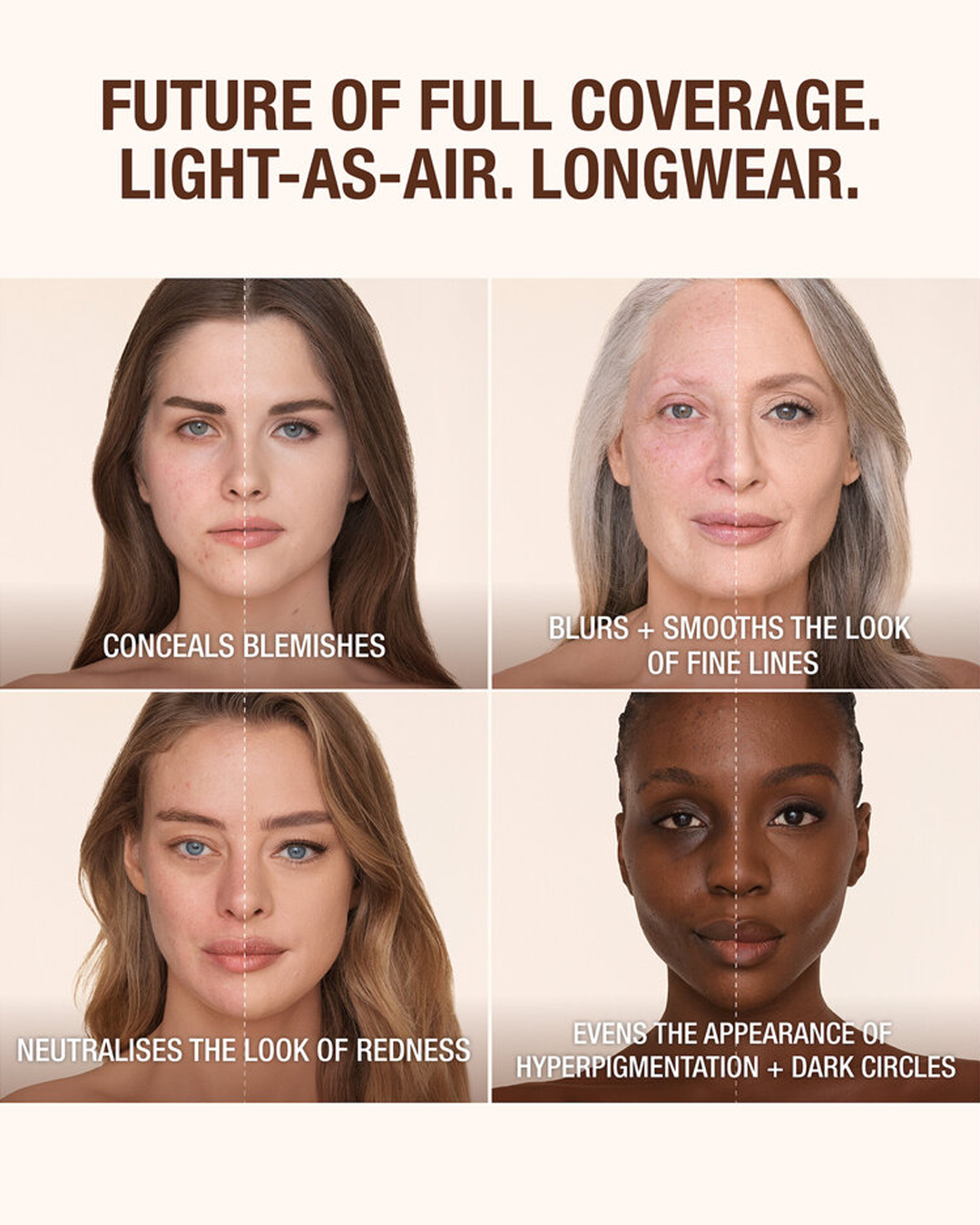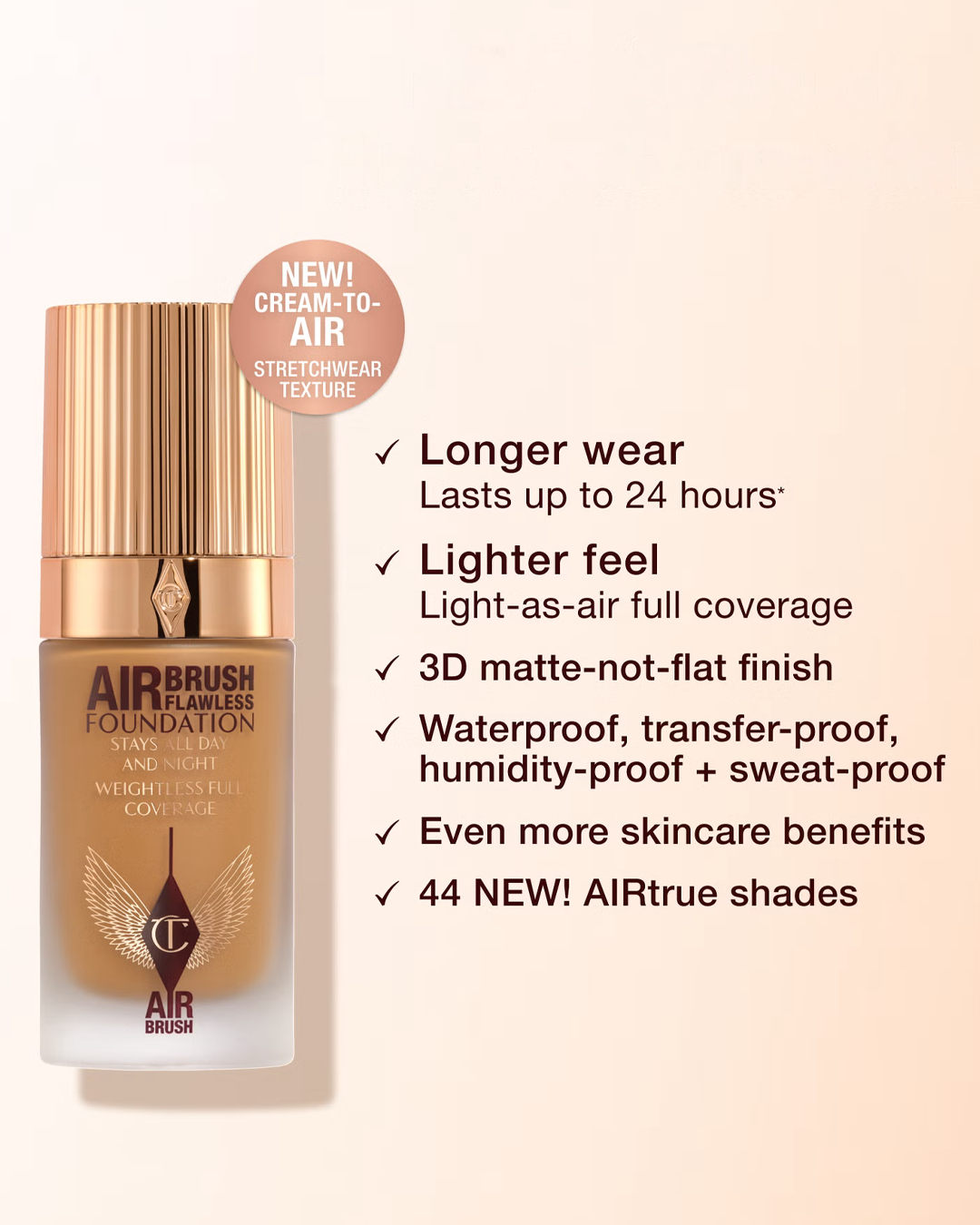 What Else You Need to Know: This light-as-air, seven-in-one foundation targets blemishes, redness, visible pores, fine lines, hyperpigmentation, uneven skin, and dark circles all in one pump. Powered by Powder Blur AIRTech for intensified visible smoothing, blurring, and retexturizing, it’s Charlotte’s Airbrush Powder effect—bottled.